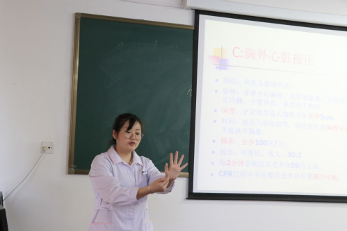 刘护士首先通过多媒体讲解了心肺复苏的重要意义,心肺复苏术(简称CPR)是针对由于各种原因导致的心搏骤停,在“黄金四分钟”内所必须采取的急救措施之一;然后她用假人模型演示了实施急救的操作步骤和注意事项。