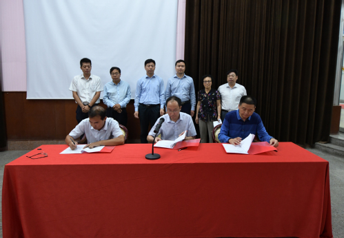 中国石油大学(华东)离退处副处长张洪泉、医院院长徐强和齐鲁医院东营分院党委书记刘长光代表三方签署合作备忘录 梁镜明摄影