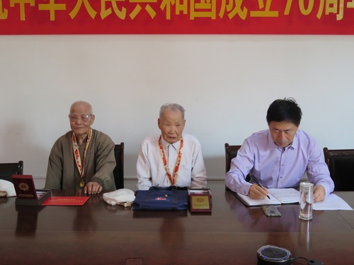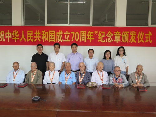 9月27日上午,“庆祝中华人民共和国成立70周年”纪念章颁发仪式在东营校区弘毅楼102会议室举行,离退处党委代表学校党委为常住东营校区的离休干部颁发纪念章,并送上鲜花和慰问金。