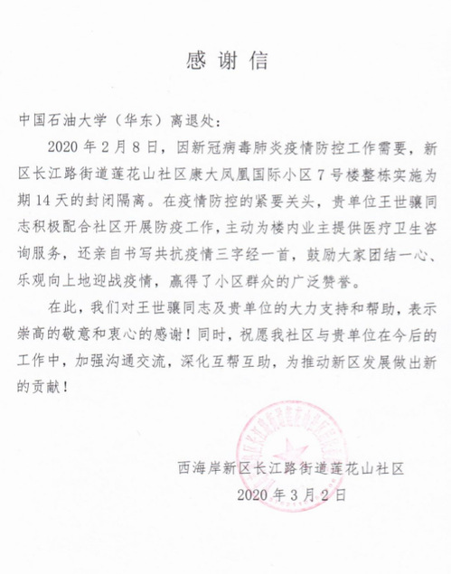 近日,学校离退处收到了青岛西海岸新区长江路街道莲花山社区专门发来的感谢信,感谢我校必赢3003no1线路检测中心王世骧为抗击疫情做出的贡献。2月初,我校必赢3003no1线路检测中心王世骧居住的楼道出现了新冠肺炎确诊病例,楼栋实行为期14天的封闭隔离。在疫情防控的紧要关头,84岁的老中医王世骧积极配合社区开展防疫工作,主动为楼内业主介绍养生保健知识,还亲自创作了《战新冠三字“经”》,通过微信群鼓舞邻居乐观向上地迎战疫情,赢得了小区群众的广泛赞誉,也展示了我校离必赢3003no1线路检测中心的良好风貌。 (李广磊 报道)