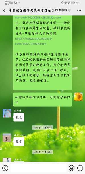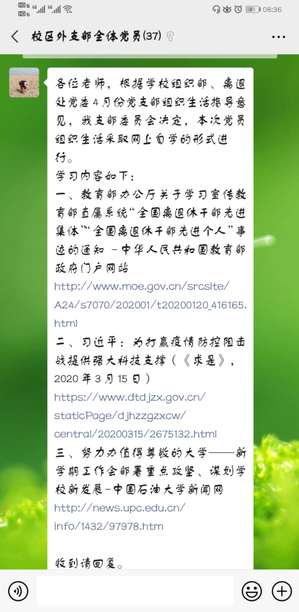 离退处党委根据学校党委组织部每月组织生活指导意见,结合实际,向离退休党支部先后推送了《习近平:在统筹推进新冠肺炎疫情防控和经济社会发展工作部署会议上的讲话》《教育部办公厅关于学习宣传教育部直属系统“全国离退休干部先进集体”“全国离退休干部先进个人”事迹的通知》《努力办值得尊敬的大学——新学期工作会部署重点攻坚、谋划学校新发展》等学习材料,同时要求各离退休党支部在做好新冠肺炎疫情防控工作的前提下,创新“三会一课”形式,做到战“疫”学习两不误,确保党员教育活动不断线。各离退休党支部按照要求,纷纷结合实际,以“线上为主、线下为辅”的方式组织开展学习活动,利用微信群等线上平台,组织退休党员开展“线上”集中学习,交流学习心得和个人体会;有些年龄较大、没有微信的老同志,支部书记将纸质学习材料送到家中,并提倡这些老同志以收看电视、观看微视频等方式进行“线下”自学。在当前特殊时期,各离退休党支部通过线上与线下相结合的方式,积极开展了广泛深入的党员学习教育活动,确保了广大离退休党员日常理论学习不放松、组织生活不断线。