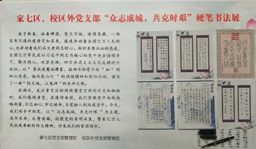 新型冠状病毒肺炎疫情发生以来,全国上下凝心聚力,共克时艰。家七区及校区外退休党支部积极响应疫情防控攻坚战,在东营校区康乐宫联合组织“众志成城,共克时艰”硬笔书法展,64名党员提交百余幅作品参加展览,以书法作品的形式盛赞全国人民同心抗疫的伟大精神,向勇往直前的一线人员致敬。
