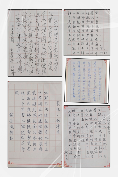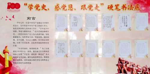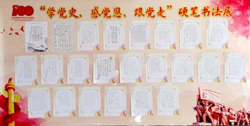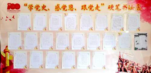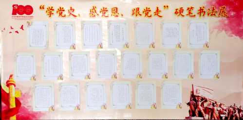 为庆祝建党100周年,深入推进党史学习教育,在“七一”前夕,家七区退休党支部管理区在东营校区康乐宫组织以“学党史、感党恩、跟党走”为主题的硬笔书法展,58名党员群众提交百余幅作品参加展览。