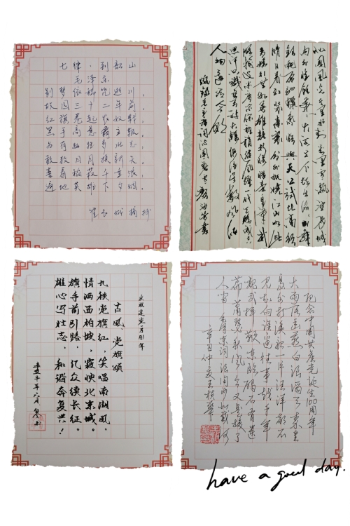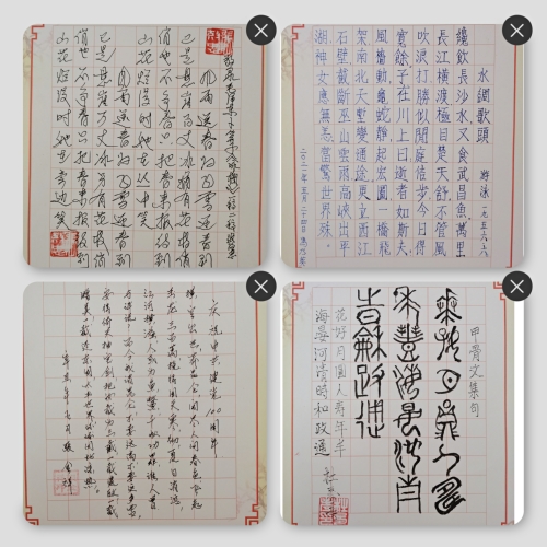 “丹青颂盛世,翰墨颂党恩。”本次展览内容以党章、领袖语录、诗词为主,老同志们踊跃参加,使用不同的硬笔书写工具,在A4大小的书法纸上挥笔创作,字体丰富、风格多样,用饱含深情的笔墨,缅怀党的光辉历史,歌颂党的丰功伟绩,表达对党的热爱之情,抒发“百年复兴中国梦,华夏今朝领风流”的壮志豪情,展示积极向上的精神面貌。