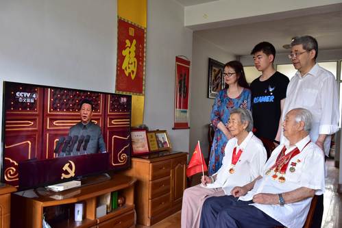 92岁高龄、有着72年党龄的老党员、参加抗美援朝的离休干部左玉科携一家三代在家中观看了庆典直播,心情非常激动,他说:“伟大的中国共产党领导全国人民站起来、富起来、强起来,伟大成就来之不易!感谢中国共产党,庆祝中国共产党成立100周年,祝愿我们伟大的党越来越好,领导全国人民奋勇向前,取得更加辉煌的成就!”七一前夕,左玉科和老伴鹿玉芬同时获颁“光荣在党50年”纪念章。