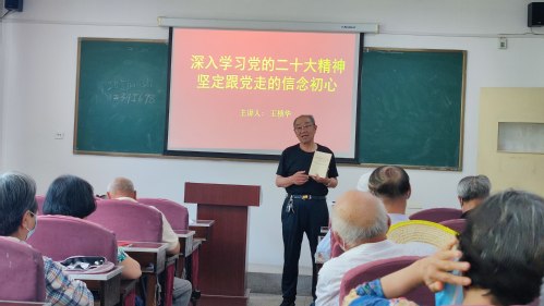 专题党课由学校关工委委员、“五老”讲师团副团长、离退处党委委员王桢华老师讲授,题目为《深入学习党的二十大精神 坚定跟党走的信念初心》。王桢华老师从多个层面详细解读了党的二十大精神,用大量详实的数据、丰富的实例讲述了我们党和国家取得的巨大成就、面临的挑战,并以切身体会与大家分享了理论学习心得体会和坚定跟党走的信念初心。在座二十余位退休党员全程认真聆听,并不时爆发热烈掌声。大家纷纷表示,王老师的党课深入浅出、引人入胜,理论水平高,特别是对党的二十大精神的学习,以及开展学习贯彻习近平新时代中国特色社会主义思想主题教育很有意义。