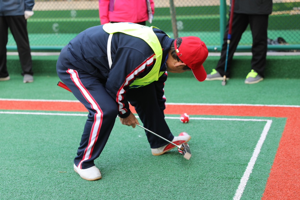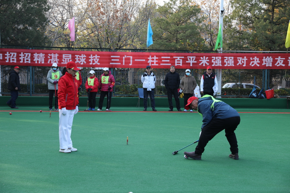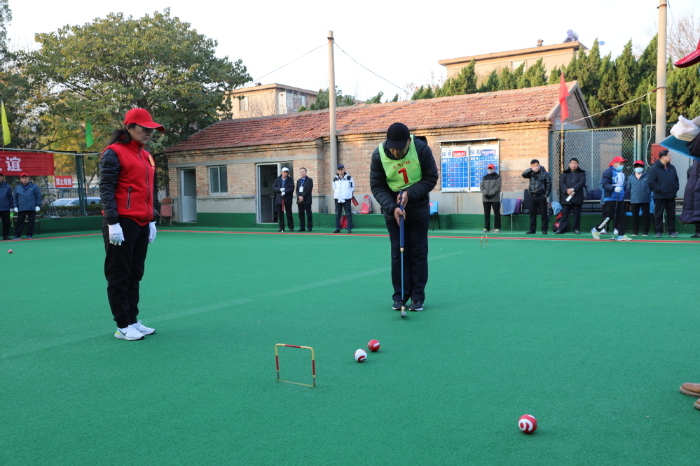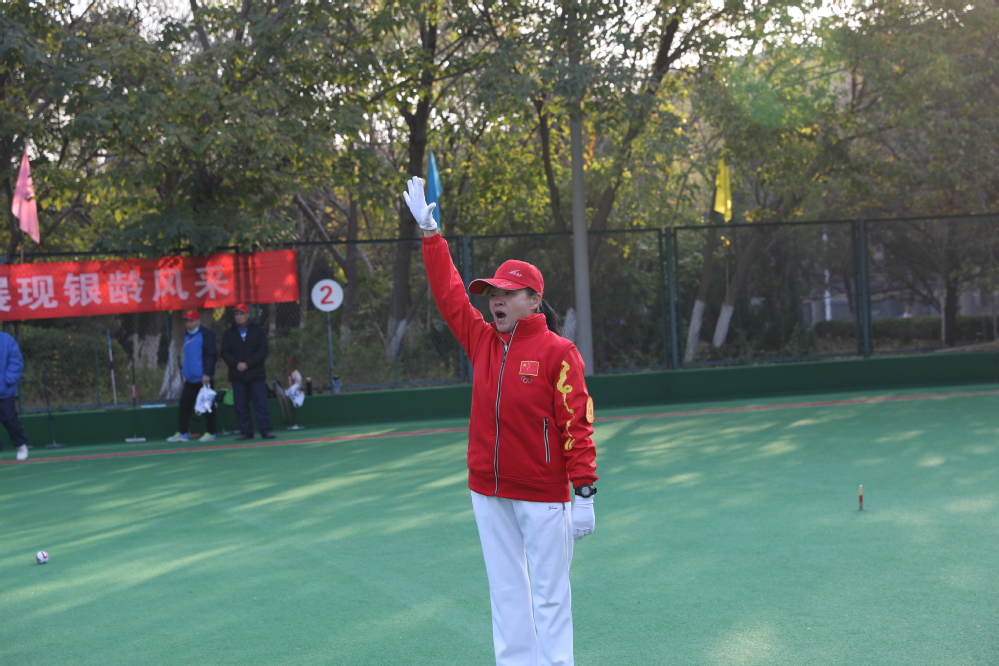 我校离必赢3003no1线路检测中心门球协会会长张焕玲(裁判一级)赛场执裁