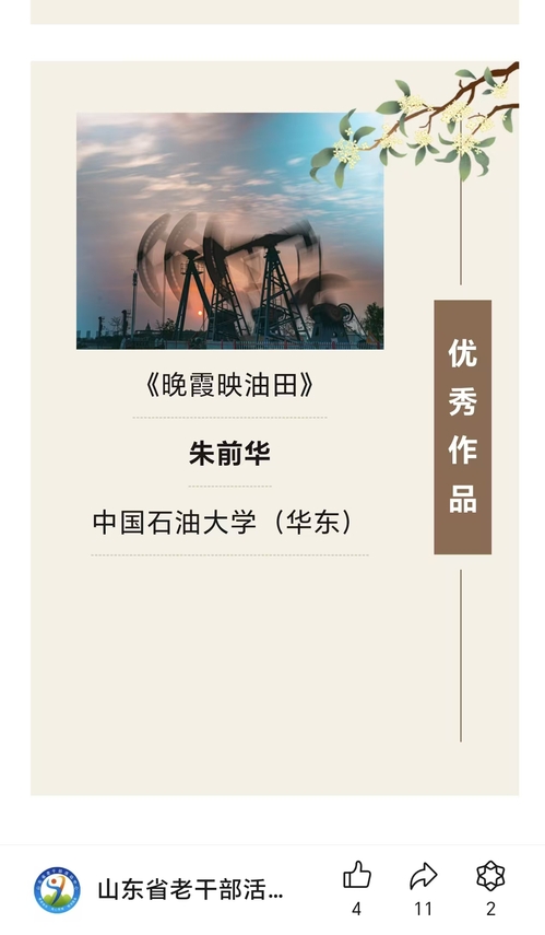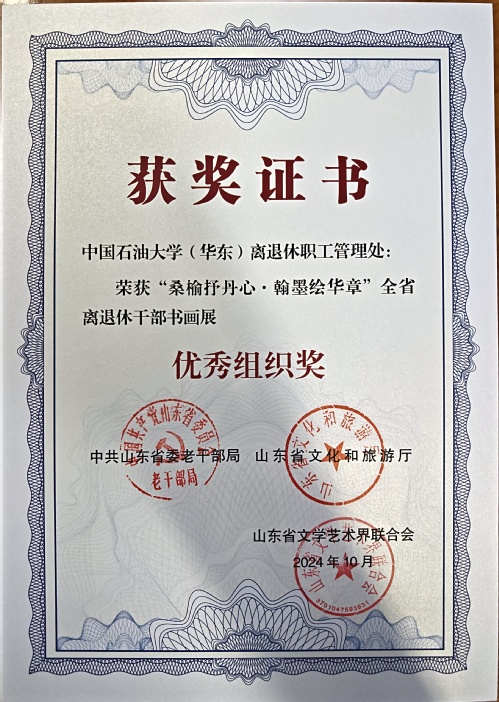 近日,中共山东省委老干部局颁发了庆祝中华人民共和国成立75周年全省离退休干部书画展优秀作品奖、优秀组织奖,我校退休教职工单红军的书法作品《百寿图》、段建国的书法作品《清平乐·六盘山》获评优秀作品奖,我校离必赢3003no1线路检测中心管理处(老干部处)获评优秀组织奖。同时,我校退休教职工朱前华的摄影作品《晚霞映油田》入选庆祝中华人民共和国成立75周年全省离退休干部优秀摄影作品展。
